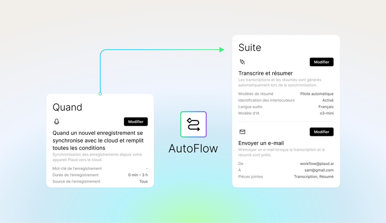 Envoie automatiquement la transcription et le résumé à l'adresse e-mail prédéfinie.