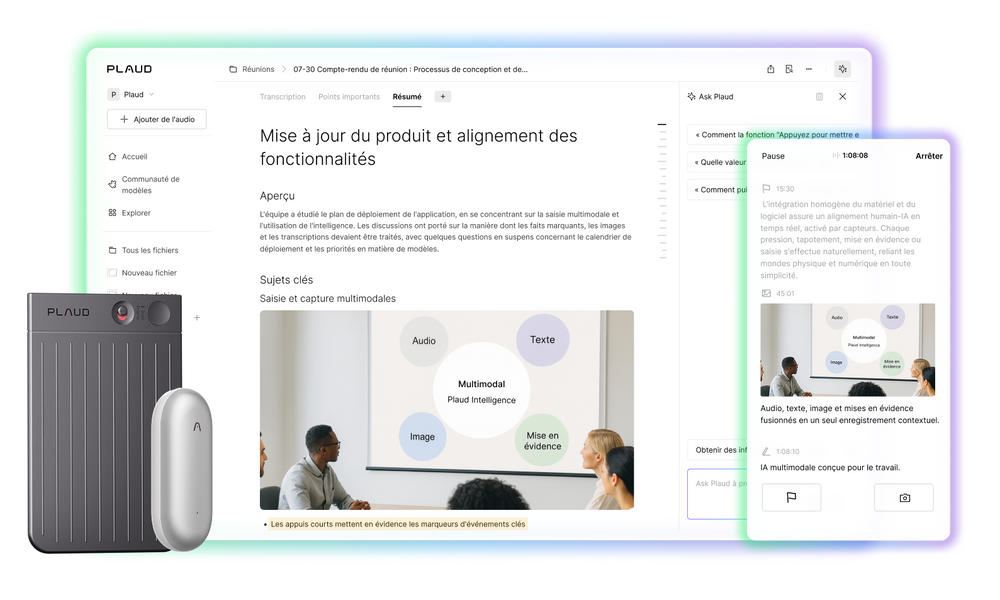 - Plaud synthétise l'intelligence à travers toutes vos conversations enregistrées, automatiquement.