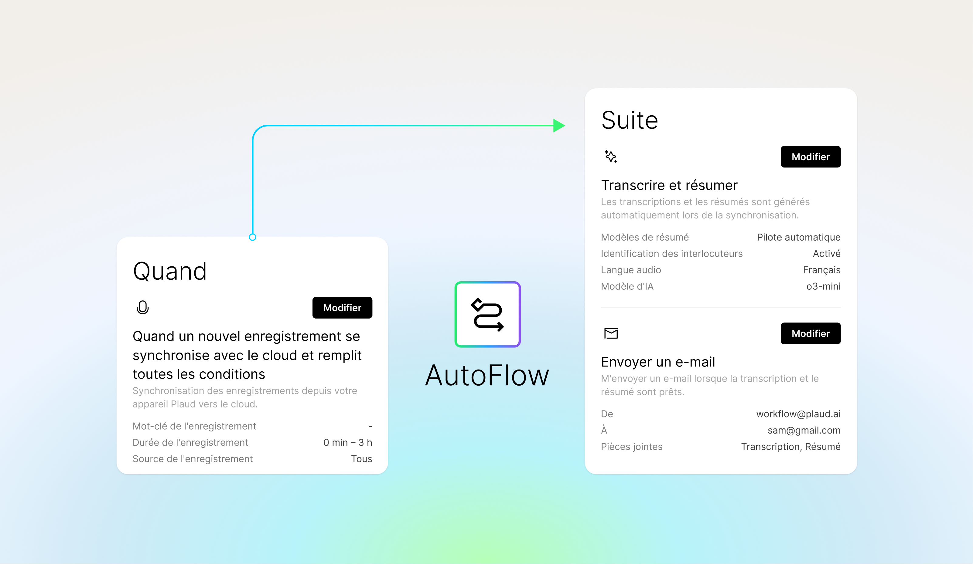 Configurez AutoFlow une seule fois et laissez-le fonctionner en mode automatique. Il gère automatiquement la transcription, le résumé et la livraison, afin que votre flux de travail soit rapide, mains libres et fiable.