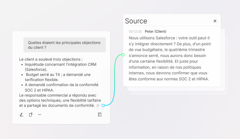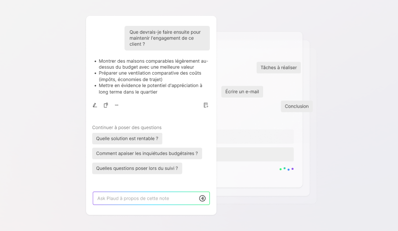 Continuez sur votre lancée après vos conversations grâce à des notes, des étapes suivantes et des suivis générés de manière transparente dans vos outils habituels.