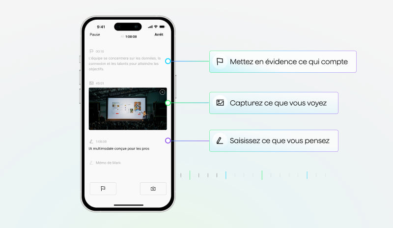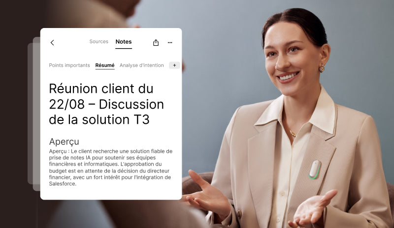 Restez concentré dans la pièce pendant que les conversations sont capturées, traitées et structurées intelligemment en tenant compte du contexte et des nuances.