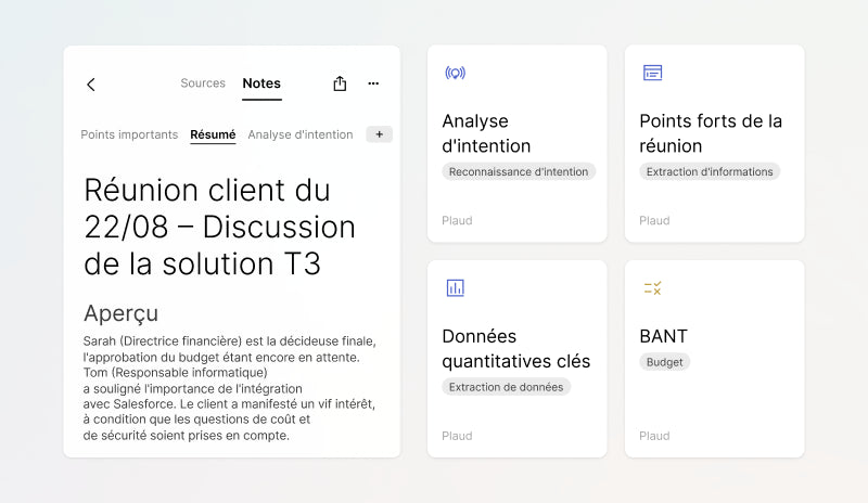 Transformez les conversations en résumés multidimensionnels grâce aux résumés BANT et plus encore. Générez des aperçus de haut niveau, extrayez des données et des informations, mettez en évidence les décisions et les tâches à accomplir, et effectuez des analyses d'intention. Tout cela à partir de la même conversation.