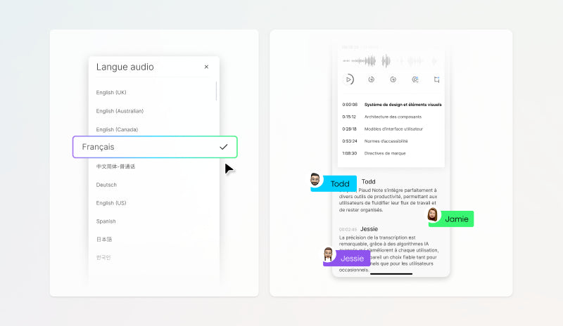 Transcrivez avec précision dans 112 langues. L’identification des interlocuteurs et les horodatages permettent d'organiser chaque conversation, afin que vous sachiez toujours qui a dit quoi et quand.